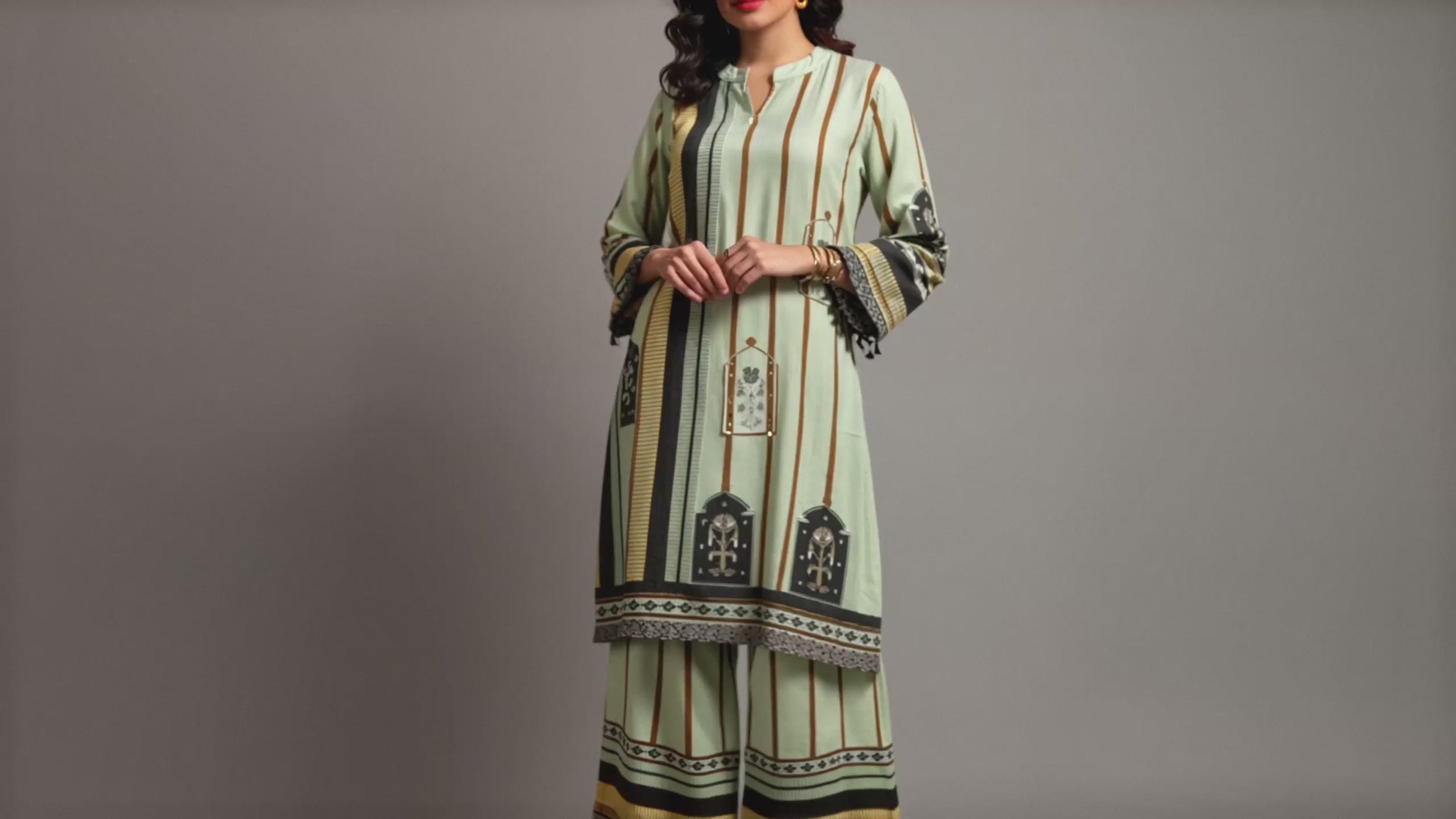 A classy, summery sage green top with multi color stripe print on top and bottom. Sequined boota embroidery on the front and tassel lace on sleeves. Comes with matching palazzo pants.